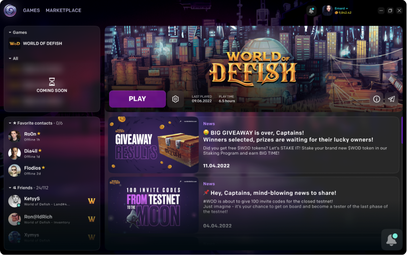 Defish Launcher is a player's space in a crossplatform desktop app. This is the heart of the Defish Studio, where all the games of our Multiverse are assembled. All games are tied up to one Defish ecosystem by Defish Connect mechanism.